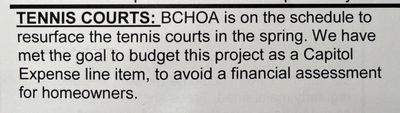 Imagine the surprise when workers showed up at the tennis courts and told nearby neighbors they were going to remove a tennis court and install pickleball courts! Danny Abrams hired them. There was no chance for public comment. And the board had not yet voted to install pickleball courts. And, the BCHOA newsletter stated that the tennis courts were to be resurfaced- no mention of pickleball. Tennis is a relatively quiet sport. The tennis courts have never been controversial.